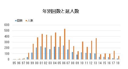 | ●握手会参加実績 | 握手会参加は通算2,682回(2020/12/23現在) (初参加は95年2月の小比類巻かほる) これまでに握手したアイドルは約2,350名、延べ約5,900名。 参加数は2006年をピークに下降線の一途を辿っています。 まだ、「引退」はしませんが今後はマイペースで。。。 ![]() <総合記録> ◆年間最多回数 : 239回 (2006年) ◆月間最多回数 : 26回 (2004年7月) ◆同日最多回数 : 6回 (2000年7月30日、2005年12月17日) ◆連続参加日数 : 7日(2010年 7月22日〜28日) <アイドル別記録> ◆通算最多回数 : 68回 /高野千恵 ◆年間最多回数 : 43回 /高野千恵(2011年) ◆月間最多回数 : 11回 /高野千恵(2011年7月) ◆同日最多回数 : 4回 /乃木坂46(2011年12月23日) ◆通算最多年数 : 11年 /下川みくに(1998年−2009年) ◆連続最多年数 : 10年 /眞鍋かをり(2000−09年) ◆連続最多月数 : 18ヶ月 /高野千恵(2010年8月−12年1月) ◆連続最多週数 : 4週 /星村麻衣(2009年3月14日−4月5日) ◆通算最多地区 : 9都府県/星村麻衣 *参加地域は関東圏以外にも札幌、小樽、仙台、石巻、新潟、伊東、名古屋、長久手、福井、大阪、京都、西宮、福岡、北九州、大分、熊本、長崎、鹿児島あり |